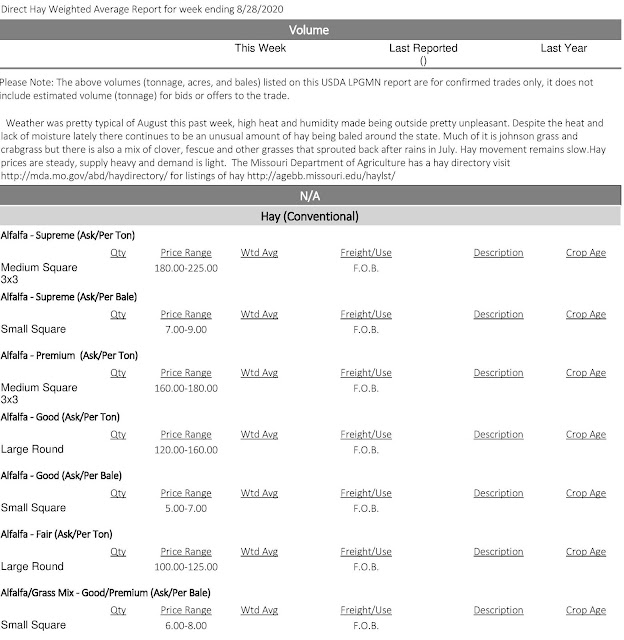 Missouri—In the Aug. 20 report, the hay business in the state remains slow, but if dryness continues it’s possible there could be some opportunities to move some hay to other states. Hay prices are steady, supply heavy and demand is light.
