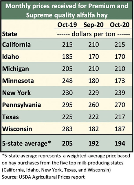 The USDA also tracks the prices of Supreme and Premium quality alfalfa in the major dairy states and determines an average price from the five leading milk-producing states. This data is being used to determine feed prices in the Dairy Margin Coverage (DMC) program.