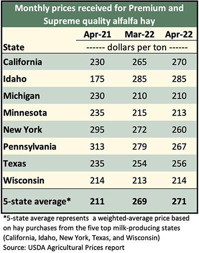 The average price for Supreme and Premium alfalfa hay rose more modestly by $2 per ton in April to $271, which followed gains the previous four months. The Supreme and Premium price stood at $60 per ton higher than it was in April 2021.