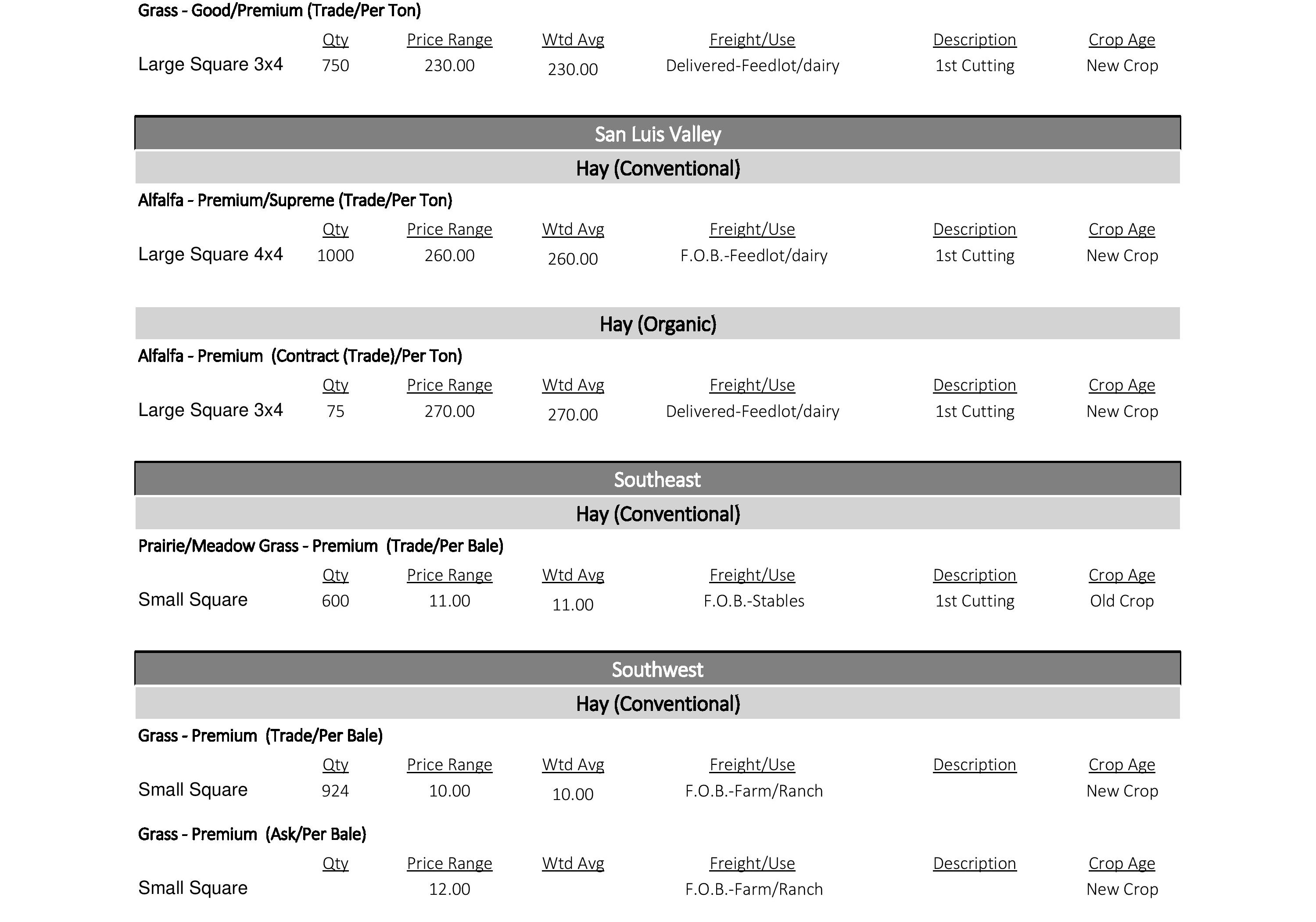 Colorado—In the July 20 report, compared to last report, trade activity and demand moderate. Hay trades are starting to gain momentum as first cutting gets wrapped up across the state. Areas that have received a lot of rain since mid May have created challenges in putting up hay that will test. Later cut alfalfa with low test is going to be moving into the grinder markets. Producers have struggled to put up hay without any rain on it.