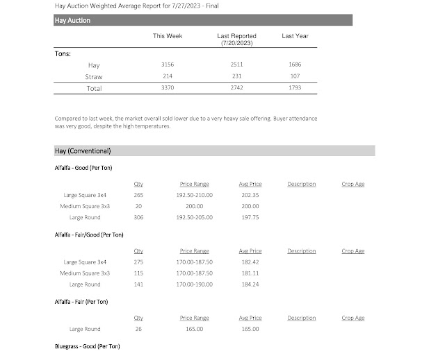 Oklahoma—In the July 21 report, compared to the last report, In western Oklahoma, trades are slow, and the demand is light. Barns are full or almost full of hay. Compared to last year, there was no hay in these areas. As we look at the central part of Oklahoma, trades are good. Demand is moderate to light demand. Barns are at capacity and need places to store hay. In eastern Oklahoma, trade is good, and the demand is high. Hay is being sold as soon as it is bailed in the field. Drought is in site once again, which is causing the demand to rise. Next report will be released Aug. 4.