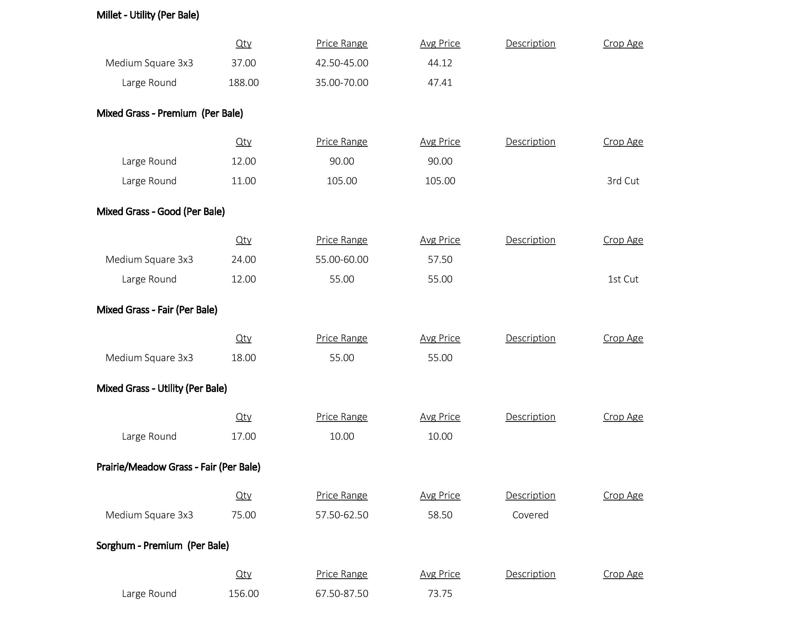 Colorado—In the Dec. 19 report, compared to last report, trade activity and demand light. Small squares of horse hay steady. Next report will be released Jan. 9, 2025.